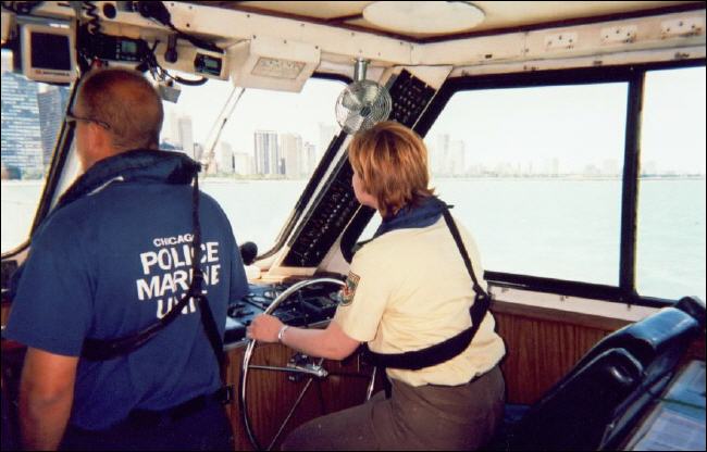 Die erste Woche im Rolling Meadows Police Department Mein Praktikum begann mit einer Bootstour auf dem Lake Michigan. Wenn das kein guter Anfang war! Richard holte mich vom Haus meiner Freunde ab und machte mit mir erst einmal eine kleine Stadtrundfahrt durch Chicago. Wir machten Halt an der Police Academy, an der Fire Academy, in der zurzeit 200 „Firefighter“ ausgebildet werden, am frisch sanierten Soldier Field, dem (Football-)Stadion der Chicago Bears, am Field Museum und der Buckingham Fountain. Am Interessantesten für mich war unsere kleine Einkaufstour bei „Kale Uniform“. Dort können Police Officer ihre Ausrüstungsgegenstände kaufen. Ähnlich wie es bei uns mit dem „Kleiderkonto“ geregelt ist, bekommen die Police Officer hier ihre Erstausstattung vom Police Department gestellt und dann jährlich einen Betrag von 500 US$, um sich neue Bekleidungs- und Ausrüstungsgegenstände zu beschaffen. Darüber hinaus wird die erste Schutzweste komplett vom Department bezahlt. Im Gegensatz zu unserer, bei der Polizei angegliederten, Kleiderkammer wird der Polizeibedarf hier von „privat“ geführten Bekleidungsgeschäften angeboten, was sich sichtlich auf das Angebot auswirkt. So war ich wirklich beeindruckt, was alles auf dem Polizeisektor angeboten wird. Es gibt ganze Abteilungen nur für Schuhe, für Gürtel/Handschuhe, für T-Shirts, Mützen u.s.w.. Unsere Kleiderkammer hatte meistens nur die Auswahl zwischen zwei oder drei Modellen, so dass ich mir fast wie im „Polizei-Paradies“ vorkam. Mittags starteten wir zu unserer 2-stündigen Bootsfahrt mit der „Marine Unit“. Chicago hat den zweitgrößten (Yacht-)Hafen in den USA. Die „Marine Unit“ verfügt über sieben Boote, die jeweils mit 3 Police Officer besetzt werden. Leider konnten wir ihren eigentlichen Standort nicht besichtigen, da die Gebäude gerade renoviert werden. Die Beamten sind deshalb behelfsweise in Containern untergebracht. Ihr Hauptaufgabebereich liegt in der Kontrolle des durch Yachten stark frequentierten Bereichs rund um den Navy Pier. Das ist ein Vergnügungsviertel mit Karussells, Bars, Restaurant, etc., das fast einen Kilometer in den See hinein ragt. Häufig wird betrunken gefahren, es kommt zu gefährlichen Manövern oder es wird zu nah an die Promenade herangefahren, wo das Wasser nicht mehr sehr tief ist. Richard hatte mich schon vor dem doch recht starken Seegang gewarnt, doch obwohl es sehr windig war (Chicago trägt den Beinamen „Windy City“) schien das Wasser zunächst sehr ruhig. Das änderte sich schlagartig, als wir keine 30 Meter von der Küste weg waren. Die Wellen wurden so stark, dass wir uns gut festhalten mussten, um nicht über Bord zu gehen. Ich war froh, dass ich eine Schwimmweste trug – und noch kein Mittag gegessen hatte… Kaum waren wir draußen, mussten wir auch schon den Besitzer einer sehr eindrucksvollen weißen Yacht verscheuchen, der zum Sonnen hinter den Markierungen und damit zu nah am Pier geankert hatte. Ebenso erging es einem Bootskapitän, der zu nah ans „Meigs Field“, einem militärischen Bereich, gefahren ist. Nach einer allgemeinen Kontrolle seiner Papieren und des vorgeschriebenen Equipments wie Schwimmwesten und Feuerlöscher, wurde er mit einem 100-US$ Ticket entlassen. Unvergesslich wird mir in Erinnerung bleiben, dass ich das Schiff auch selber steuern durfte. Das hat unheimlich viel Spaß gemacht. Zum krönenden Abschluss bekam ich vom Lieutenant ein entsprechendes Kapitäns- T-Shirt. Ich war sehr angetan, wie nett und freundlich die Kollegen mir alles gezeigt haben. Am Wochenende fand das Fußballspiel Manchester United gegen Bayern München im „Soldier Field“ statt. Im Allgemeinen bin ich nicht sehr an Fußball interessiert, aber ein Spiel im neuen Football-Stadion wollte ich doch gerne einmal gesehen haben. Auch hier hatte ich viel Glück, denn ich bekam kurzfristig eine Freikarte geschenkt. Leider kann ich nicht sagen, wie groß das Stadion ist, aber es war ein Erlebnis! Vor allem weil ich in der 4. Reihe hinter dem bayrischen Tor gesessen habe und die Spieler hautnah erleben konnte. Manch Bayernfan hätte wahrscheinlich sein letztes Hemd für eine solche Karte gegeben. Leider war das Spiel nicht sehr spannend und endete mit 0:0 – ein willkommener Grund für die amerikanischen Kollegen zu sagen, dass deutscher „Soccer“ sowieso ein langweiliges Spiel und nicht mit American Football zu vergleichen ist. Am Montag begann dann meine erste „richtige“ Praktikumswoche. Hier begleitete ich ausschließlich den uniformierten Einsatzdienst. Viele Grüße Britta Voller