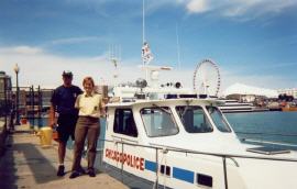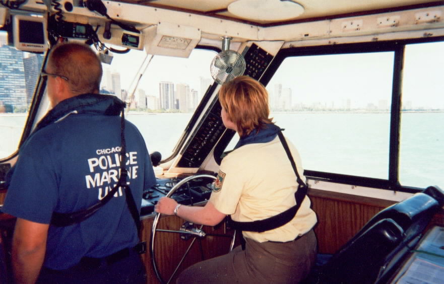 Die erste Woche im Rolling Meadows Police Department Mein Praktikum begann mit einer Bootstour auf dem Lake Michigan. Wenn das kein guter Anfang war! Richard holte mich vom Haus meiner Freunde ab und machte mit mir erst einmal eine kleine Stadtrundfahrt durch Chicago. Wir machten Halt an der Police Academy, an der Fire Academy, in der zurzeit 200 „Firefighter“ ausgebildet werden, am frisch sanierten Soldier Field, dem (Football-)Stadion der Chicago Bears, am Field Museum und der Buckingham Fountain. Am Interessantesten für mich war unsere kleine Einkaufstour bei „Kale Uniform“. Dort können Police Officer ihre Ausrüstungsgegenstände kaufen. Ähnlich wie es bei uns mit dem „Kleiderkonto“ geregelt ist, bekommen die Police Officer hier ihre Erstausstattung vom Police Department gestellt und dann jährlich einen Betrag von 500 US$, um sich neue Bekleidungs- und Ausrüstungsgegenstände zu beschaffen. Darüber hinaus wird die erste Schutzweste komplett vom Department bezahlt. Im Gegensatz zu unserer, bei der Polizei angegliederten, Kleiderkammer wird der Polizeibedarf hier von „privat“ geführten Bekleidungsgeschäften angeboten, was sich sichtlich auf das Angebot auswirkt. So war ich wirklich beeindruckt, was alles auf dem Polizeisektor angeboten wird. Es gibt ganze Abteilungen nur für Schuhe, für Gürtel/Handschuhe, für T-Shirts, Mützen u.s.w.. Unsere Kleiderkammer hatte meistens nur die Auswahl zwischen zwei oder drei Modellen, so dass ich mir fast wie im „Polizei-Paradies“ vorkam. Mittags starteten wir zu unserer 2-stündigen Bootsfahrt mit der „Marine Unit“. Chicago hat den zweitgrößten (Yacht-)Hafen in den USA. Die „Marine Unit“ verfügt über sieben Boote, die jeweils mit 3 Police Officer besetzt werden. Leider konnten wir ihren eigentlichen Standort nicht besichtigen, da die Gebäude gerade renoviert werden. Die Beamten sind deshalb behelfsweise in Containern untergebracht. Ihr Hauptaufgabebereich liegt in der Kontrolle des durch Yachten stark frequentierten Bereichs rund um den Navy Pier. Das ist ein Vergnügungsviertel mit Karussells, Bars, Restaurant, etc., das fast einen Kilometer in den See hinein ragt. Häufig wird betrunken gefahren, es kommt zu gefährlichen Manövern oder es wird zu nah an die Promenade herangefahren, wo das Wasser nicht mehr sehr tief ist. Richard hatte mich schon vor dem doch recht starken Seegang gewarnt, doch obwohl es sehr windig war (Chicago trägt den Beinamen „Windy City“) schien das Wasser zunächst sehr ruhig. Das änderte sich schlagartig, als wir keine 30 Meter von der Küste weg waren. Die Wellen wurden so stark, dass wir uns gut festhalten mussten, um nicht über Bord zu gehen. Ich war froh, dass ich eine Schwimmweste trug – und noch kein Mittag gegessen hatte… Kaum waren wir draußen, mussten wir auch schon den Besitzer einer sehr eindrucksvollen weißen Yacht verscheuchen, der zum Sonnen hinter den Markierungen und damit zu nah am Pier geankert hatte. Ebenso erging es einem Bootskapitän, der zu nah ans „Meigs Field“, einem militärischen Bereich, gefahren ist. Nach einer allgemeinen Kontrolle seiner Papieren und des vorgeschriebenen Equipments wie Schwimmwesten und Feuerlöscher, wurde er mit einem 100-US$ Ticket entlassen. Unvergesslich wird mir in Erinnerung bleiben, dass ich das Schiff auch selber steuern durfte. Das hat unheimlich viel Spaß gemacht. Zum krönenden Abschluss bekam ich vom Lieutenant ein entsprechendes Kapitäns- T-Shirt. Ich war sehr angetan, wie nett und freundlich die Kollegen mir alles gezeigt haben. Am Wochenende fand das Fußballspiel Manchester United gegen Bayern München im „Soldier Field“ statt. Im Allgemeinen bin ich nicht sehr an Fußball interessiert, aber ein Spiel im neuen Football-Stadion wollte ich doch gerne einmal gesehen haben. Auch hier hatte ich viel Glück, denn ich bekam kurzfristig eine Freikarte geschenkt. Leider kann ich nicht sagen, wie groß das Stadion ist, aber es war ein Erlebnis! Vor allem weil ich in der 4. Reihe hinter dem bayrischen Tor gesessen habe und die Spieler hautnah erleben konnte. Manch Bayernfan hätte wahrscheinlich sein letztes Hemd für eine solche Karte gegeben. Leider war das Spiel nicht sehr spannend und endete mit 0:0 – ein willkommener Grund für die amerikanischen Kollegen zu sagen, dass deutscher „Soccer“ sowieso ein langweiliges Spiel und nicht mit American Football zu vergleichen ist. Am Montag begann dann meine erste „richtige“ Praktikumswoche. Hier begleitete ich ausschließlich den uniformierten Einsatzdienst. Viele Grüße Britta Voller